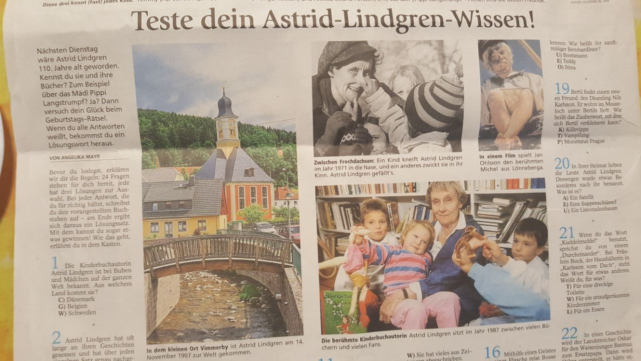 Scheinbar gehört unser Ort jetzt zu Vimmerby im schwedischen Småland. Das legt zumindest ein Rätsel zur dort geborenen Schriftstellerin Astrid Lindgren nahe, das im Oberbayrischen Volksblatt letzte Woche abgedruckt wurde.